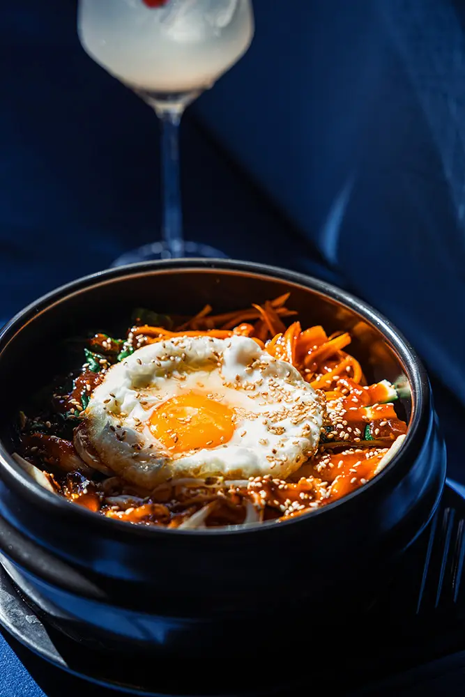 Reis mit verschiedenem Gemüse, und Spiegelei im heißen Steintopf, dazu Chillipaste, Sesam, serviert mit • Beef 17.9 € • Vegetarische 9.9 €